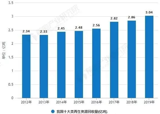 統(tǒng)計數(shù)據(jù)顯示,2012年我國再生資源回收量已達(dá)2.34萬億噸,到了2016年我國再生資源回收量超2.5億噸。