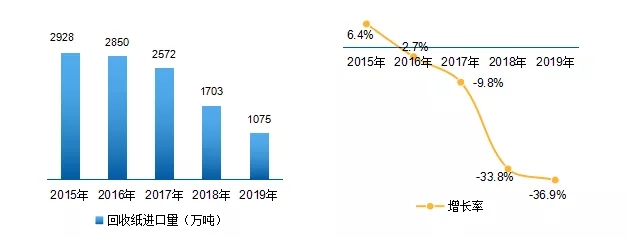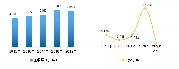 圖3 2015-2019年我國(guó)廢紙回收量及增長(zhǎng)速度